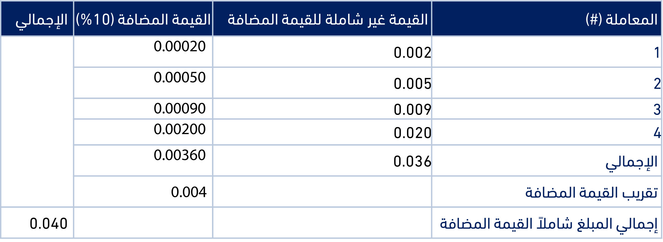في حال قام الخاضع للقيمة المضافة باحتساب رسوم قدرها 0.002 دينار بحريني لكل معاملة على عملائه في مملكة البحرين، سوف يكون مبلغ القيمة المضافة للمعاملة هو 0.0002 دينار بحريني.